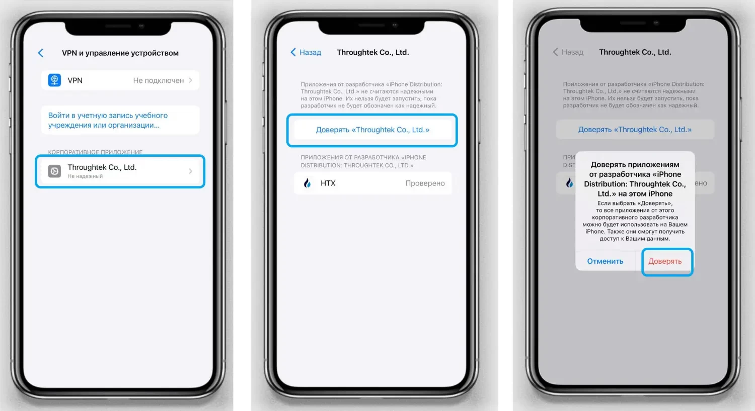 - Выберите корпоративное приложение «Здесь будет надпись...» и добавьте его в список доверенных.