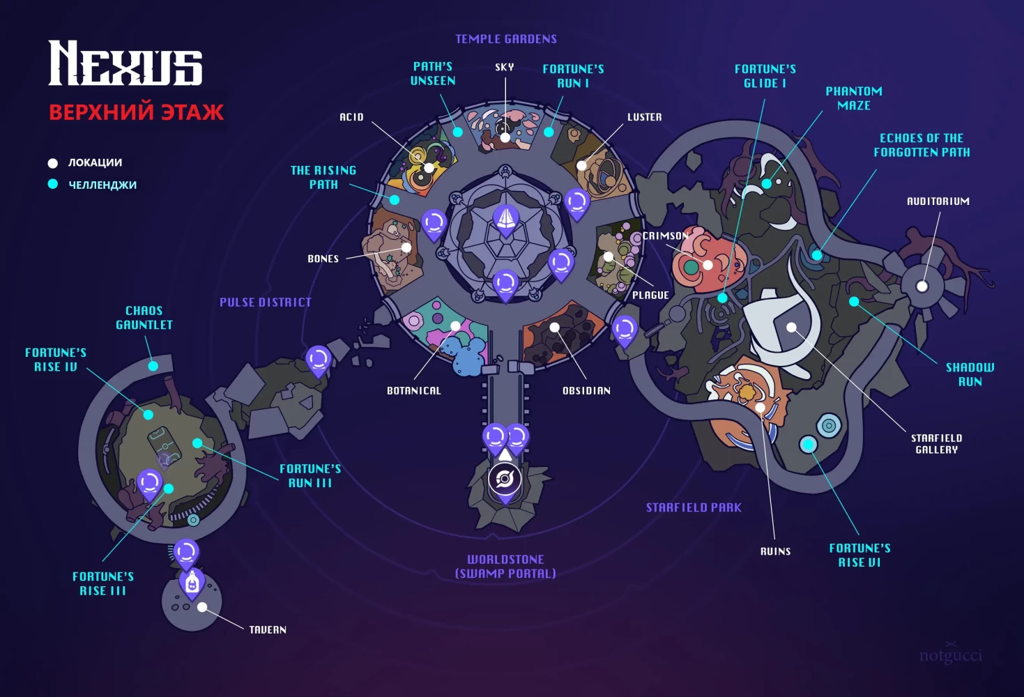 Условно верхний этаж (откуда начинается погружение) делится на Nexus, Swamp, Pulse District и Starfield Park. Выглядит как показано на изображении ниже. Для выполнения доступны челленджи: The Rising Path, Paths Unseen, Fortune's Run I, Fortune's Rise VII, Echoes of the Forgotten Path, Phantom Maze, Shadow Run, Leap of Faith, Fortune's Rise VIII, Fortune's Rise VI, Fortune's Rise V, Fortune's Rise III, Fortune's Rise IV, Chaos Gauntlet, Fortune's Run III.