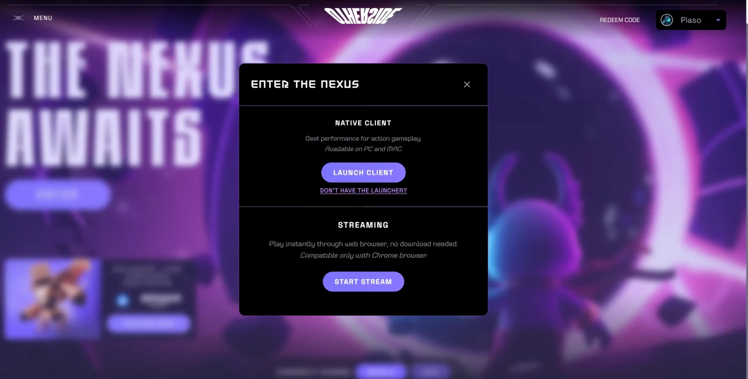 Сейчас в метавселенной открыто только три полноценных земли. Погружение начинается с Nexus — достаточно выбрать пункт «Enter». Далее предлагается два варианта входа: загрузка отдельного клиента (для тех, у кого хорошее железо и нужна высокая графика) или через браузер (поддерживается только Chrome), для большинства будет достаточно второго варианта.