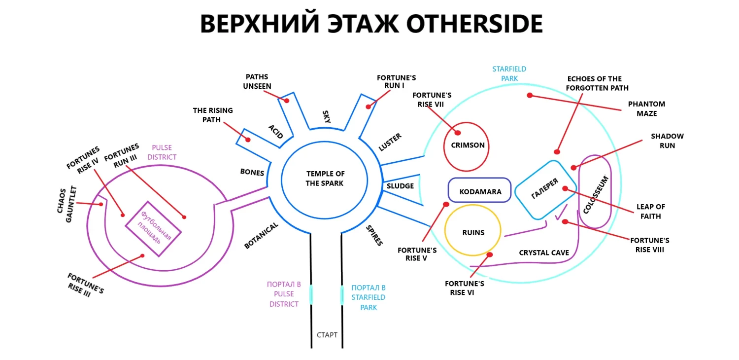 Условно верхний этаж (откуда начинается погружение) выглядит как показано на изображении ниже. Для выполнения доступны челленджи: The Rising Path, Paths Unseen, Fortune's Run I, Fortune's Rise VII, Echoes of the Forgotten Path, Phantom Maze, Shadow Run, Leap of Faith, Fortune's Rise VIII, Fortune's Rise VI, Fortune's Rise V, Fortune's Rise III, Fortune's Rise IV, Chaos Gauntlet, Fortune's Run III.