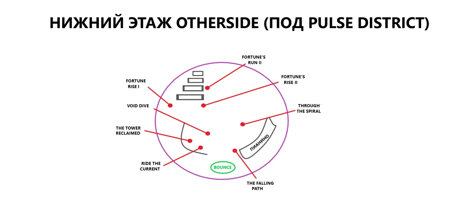 Карта нижнего этажа, где доступны челленджи: Fortune's Rise I, Void Dive, The Tower Reclaimed, Ride the Current, The Falling Path, Through the Spiral, Fortune's Rise II, Fortune's Run II.