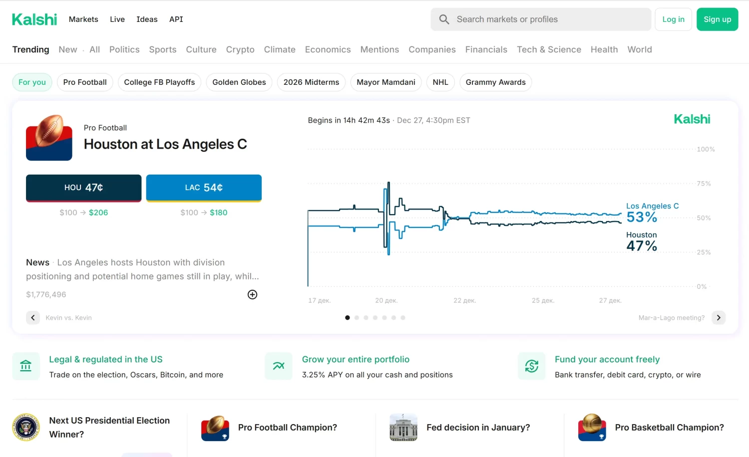 Kalshi. Регулируемый TradFi-игрок, работающий в правовом поле США. Токена нет и, с высокой вероятностью, в ближайшей перспективе не будет. Любой возможный выход на публичный рынок, скорее всего, состоится уже на пике интереса и по высоким мультипликаторам.