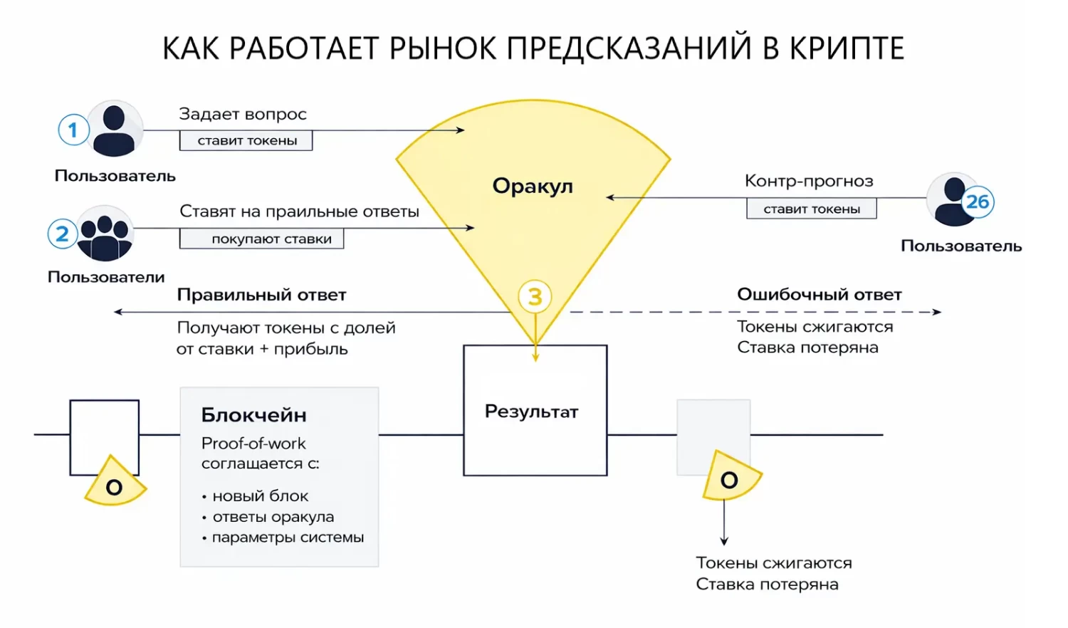 - создаётся рынок с вариантами исходов (чаще всего Да / Нет);
