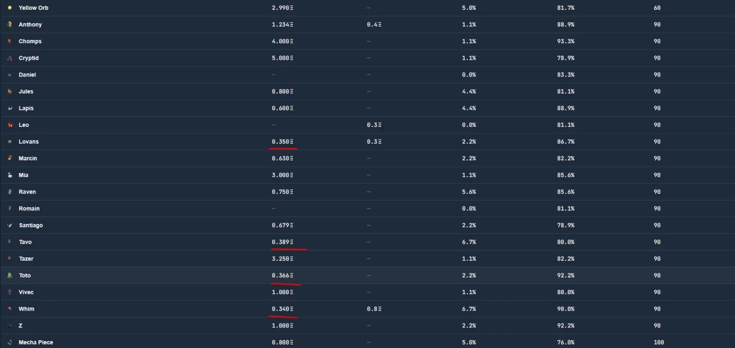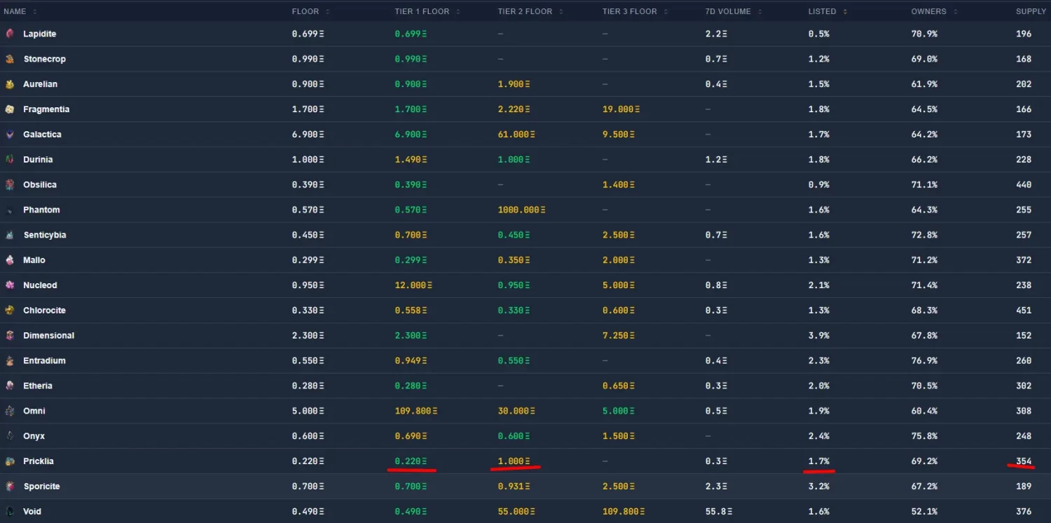 Например, сейчас довольно редкий ресурс Pricklia продаётся по цене 0,22 ETH. Тир 1 ресурс стоит 0,22, а тир 2 уже стоит 1 ETH. При этом таких земель открыто продаётся всего 6 штук (1,7%). Кроме того, похожие по количеству ресурсы стоят не дешевле, чем Pricklia, так что землю с таким ресурсом брать выгодно.