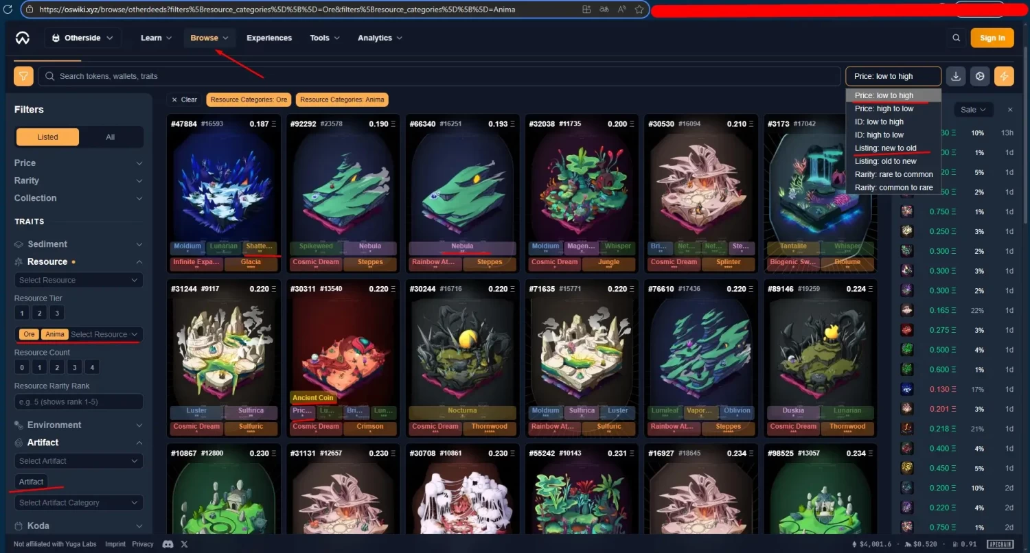 Ресурсы могут быть или отсутствовать на севере (обозначается как N, North Resource), юге (S, South Resource), западе (W, West Resource) или востоке (E, East Resource). Отсортировать ресурсы по любому атрибуту и цене поможет Otherside Wiki. Также там есть раздел аналитики по ресурсам, позволяющий охватить состояние рынка целиком.