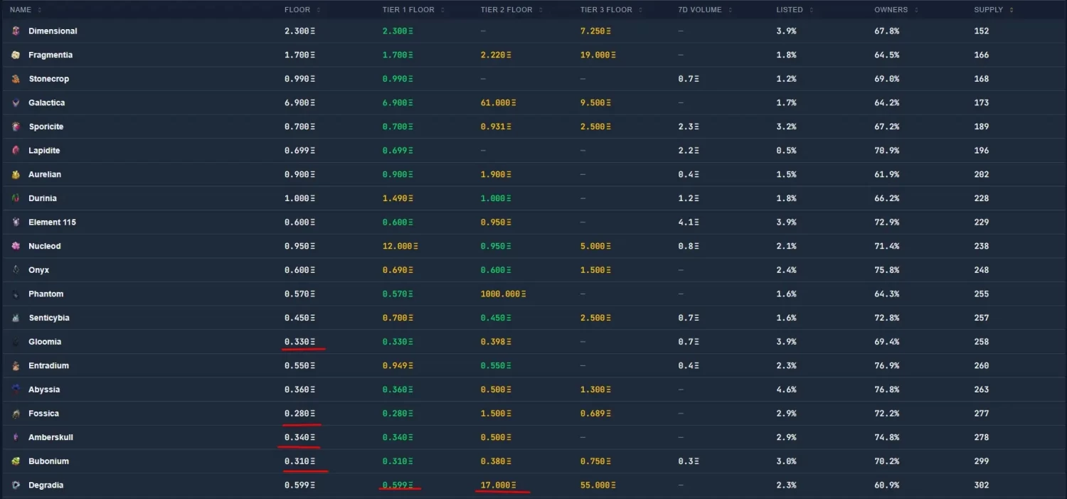 Обратите внимание, что Degradia 2 и 3-го тира ценится очень высоко, а первого — относительно дёшево. Это может означать, что ресурс недооценён рынком.