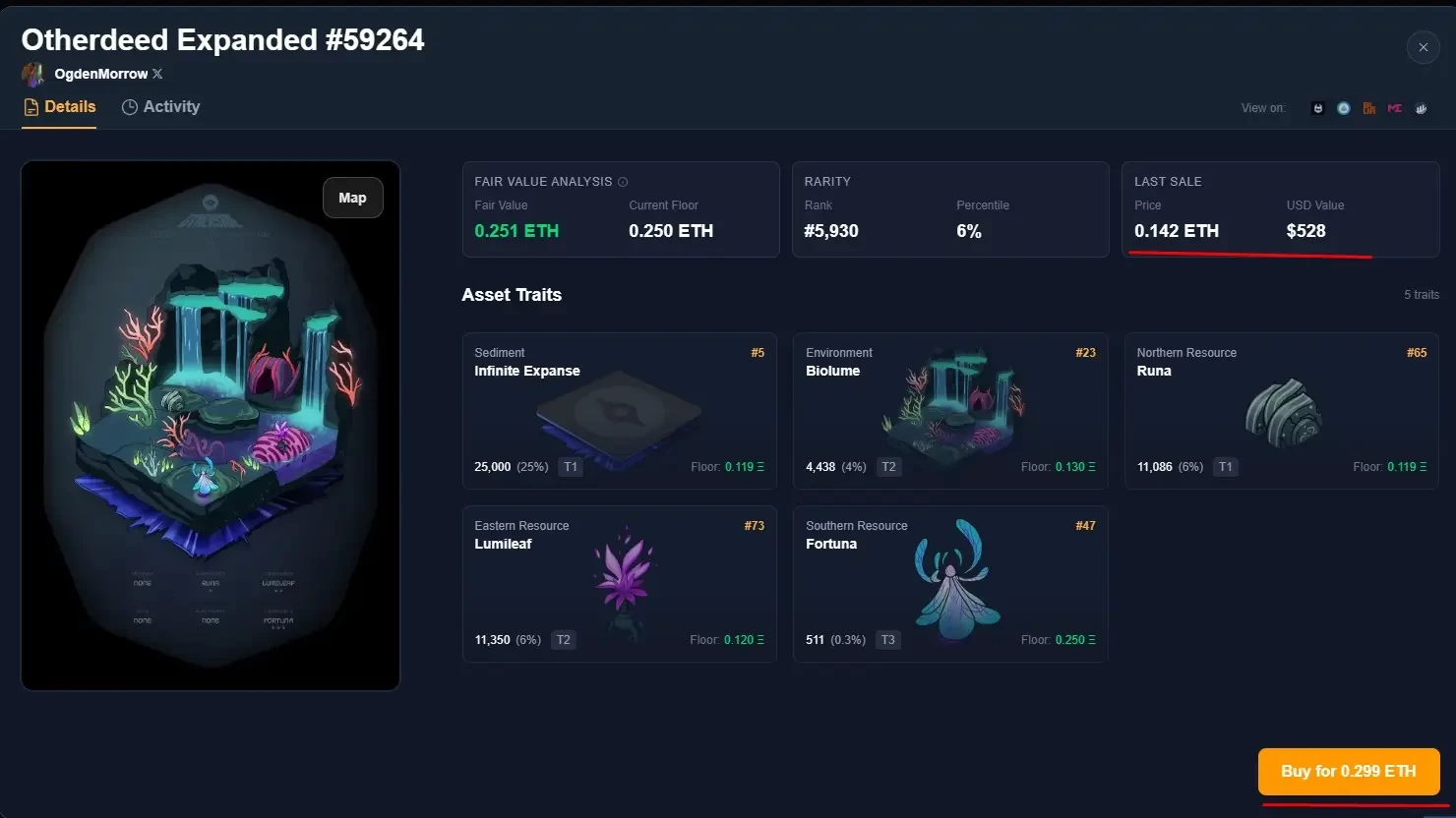 Найти коллекцию земель можно на маркетплейсах: Magic Eden, OpenSea и Blur. Для покупки обычно доступно ≈ 3% от саплая (общего количества). Первой была выпущена коллекция земель Otherdeed for Otherside, а вторая — Otherdeed Expanded. Otherdeed Expanded — это обновлённый контракт для своего предшественника, увеличивающий гибкость для работы с NFT в будущем. Пусть Otherdeed for Otherside и стоит дороже, с большой вероятностью его придётся переносить на новый контракт (Expanded) для взаимодействия в игре. Так что Expanded — лучший выбор.