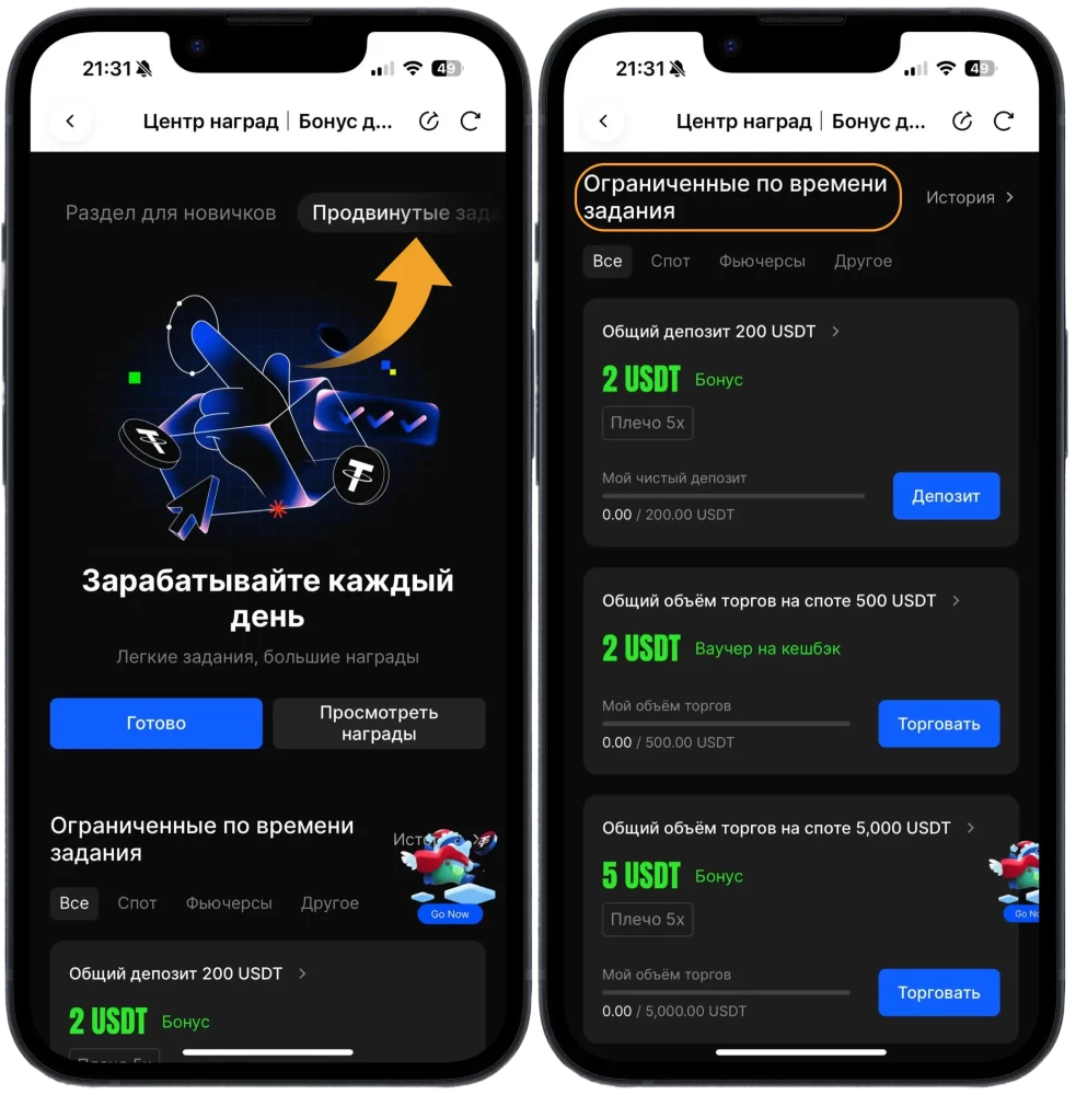 До 11 000 USDT и тайная коробка – ваучеры и фьючерсные награды за выполнение заданий.