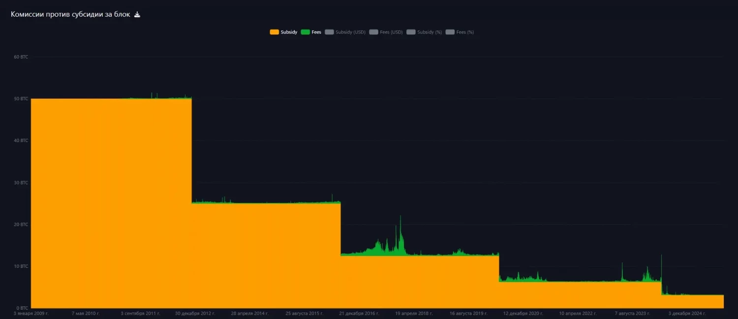 | Награда за блок | 50 BTC | 25 BTC | 12,5 BTC | 6,25 BTC | 3,125 BTC |