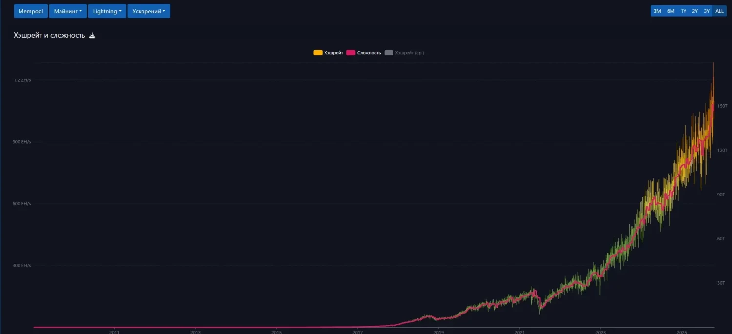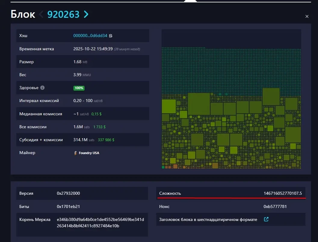 Сложность публикуется в заголовке каждого блока. Сегодня она составляет 146,72 T. К слову, сложность почти всегда растёт, и на графике лишь иногда можно заметить небольшие спады. Фактически сложность означает, что каждые 2 недели вы, скорее всего, будете зарабатывать меньше со своего асика, чем за предыдущие 2.