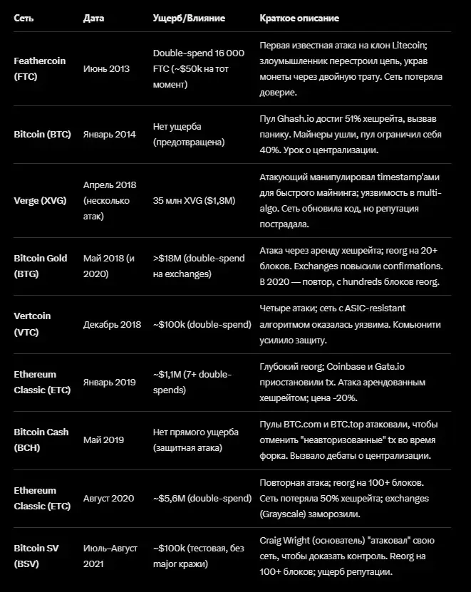 Пулы могут сговориться или объединиться в один. Это позволит им откатить транзакции (реорганизацию), совершить двойную трату (например, биржа засчитала депозит, а потом блокчейн ушёл в другую ветвь). Эта атака осуществлялась на практике на более мелких блокчейнах, как ETC или Bitcoin Gold, или даже на раннем Bitcoin (хотя и без последствий).