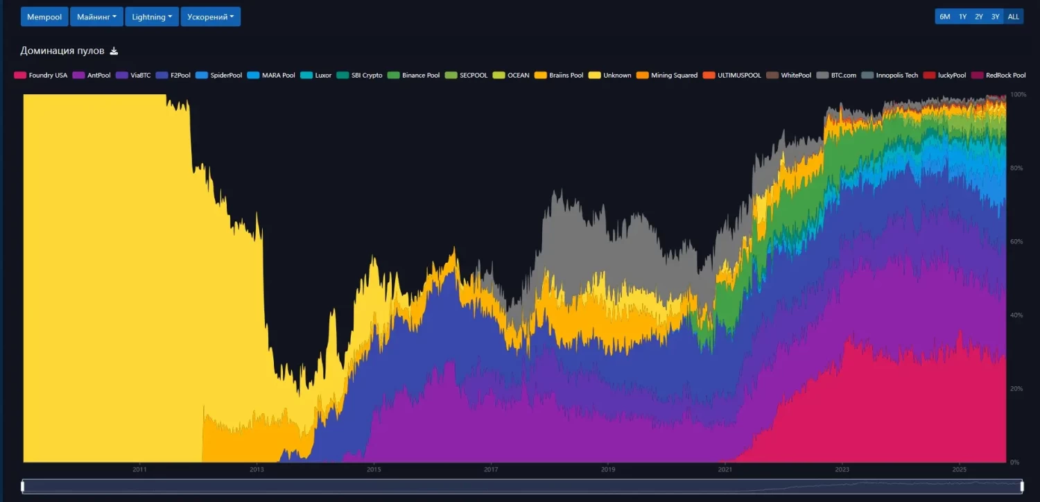 Как майнить биткоин, если шанс его получить — 2% в год? Сегодня майнеры объединяются в пулы. Вместо того чтобы каждый играл в лотерею, майнеры объединяют свои мощности для решения задачи. Неважно, кто её нашёл в пуле — все майнеры делят награду между собой. На протяжении истории биткоина пулы выглядели так: