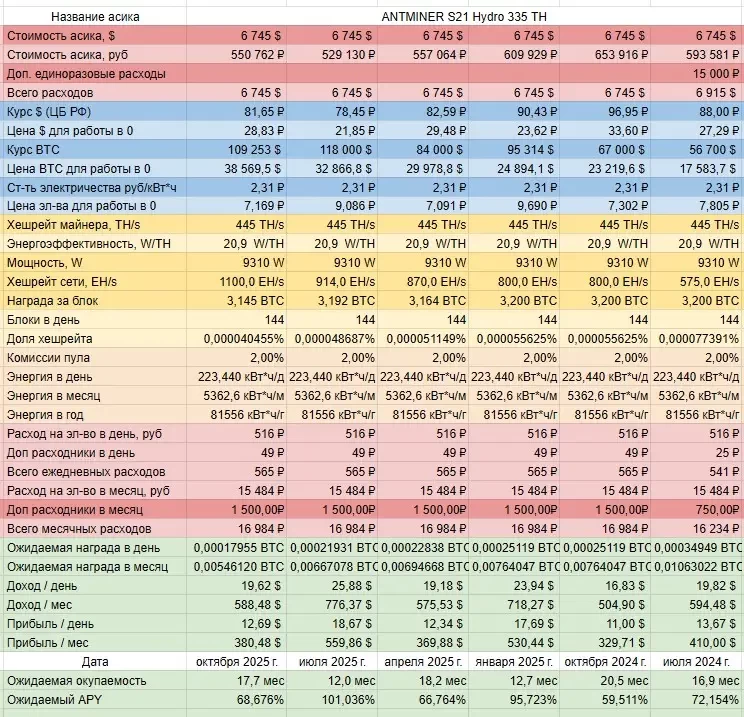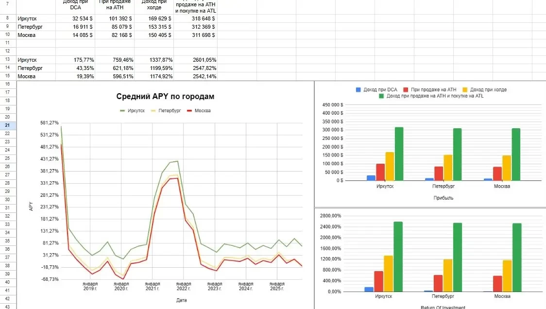 Давайте посчитаем прибыльность добычи BTC с 2019 по 2025 год для трёх регионов в России — Иркутска (самая дешёвая энергия), Санкт-Петербурга и Москвы (популярные города). Вот пример того, как это может выглядеть: