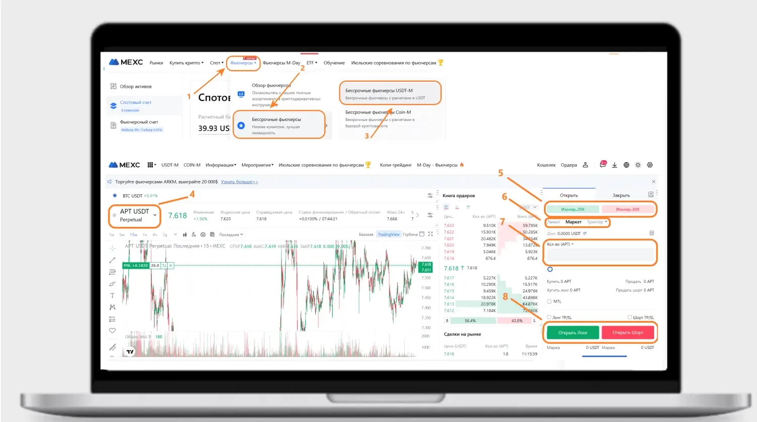 Использовать бонусы для торговли необходимо на «Бессрочных фьючерсах». В открывшемся терминале нужно определиться с монетой для торговли, выбрать размер торгового плеча и вид сделки, указать количество токенов, открыть позицию в лонг (на рост) или в шорт (на падение). Когда сделка пройдёт, внизу экрана — в разделе «Открытые ордера» — появится вся информация по ней.