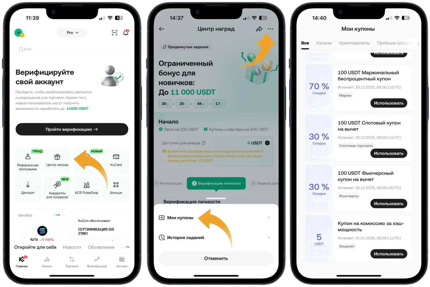 🎁 Благодаря промокоду можно получить ограниченный по времени бонус для новичков – до 11 000 USDT в «Центре наград». С этим видом бонуса есть один нюанс – биржа постоянно тасует размер вознаграждения, поэтому не нужно удивляться, если вознаграждение меньше или больше, чем указано у нас на сайте. Для доступа ко всем наградам необходимо верифицировать профиль и следовать инструкциям биржи. Выполнение условий программы бонусов рекомендуется только в рамках стандартной торговли, а не исключительно ради получения наград, не забывайте о рисках.